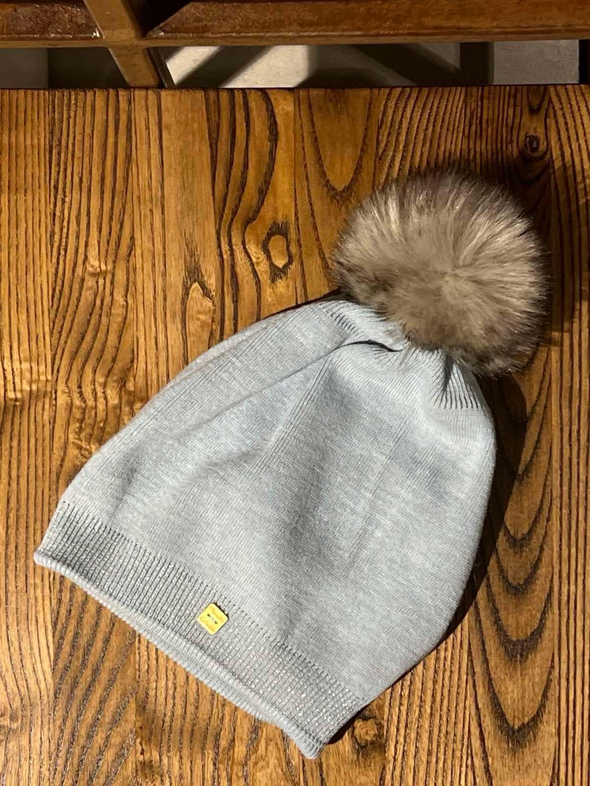 Minkšto audinio kepurė, dekoruota blizgia juostele ir eko kailio kutu