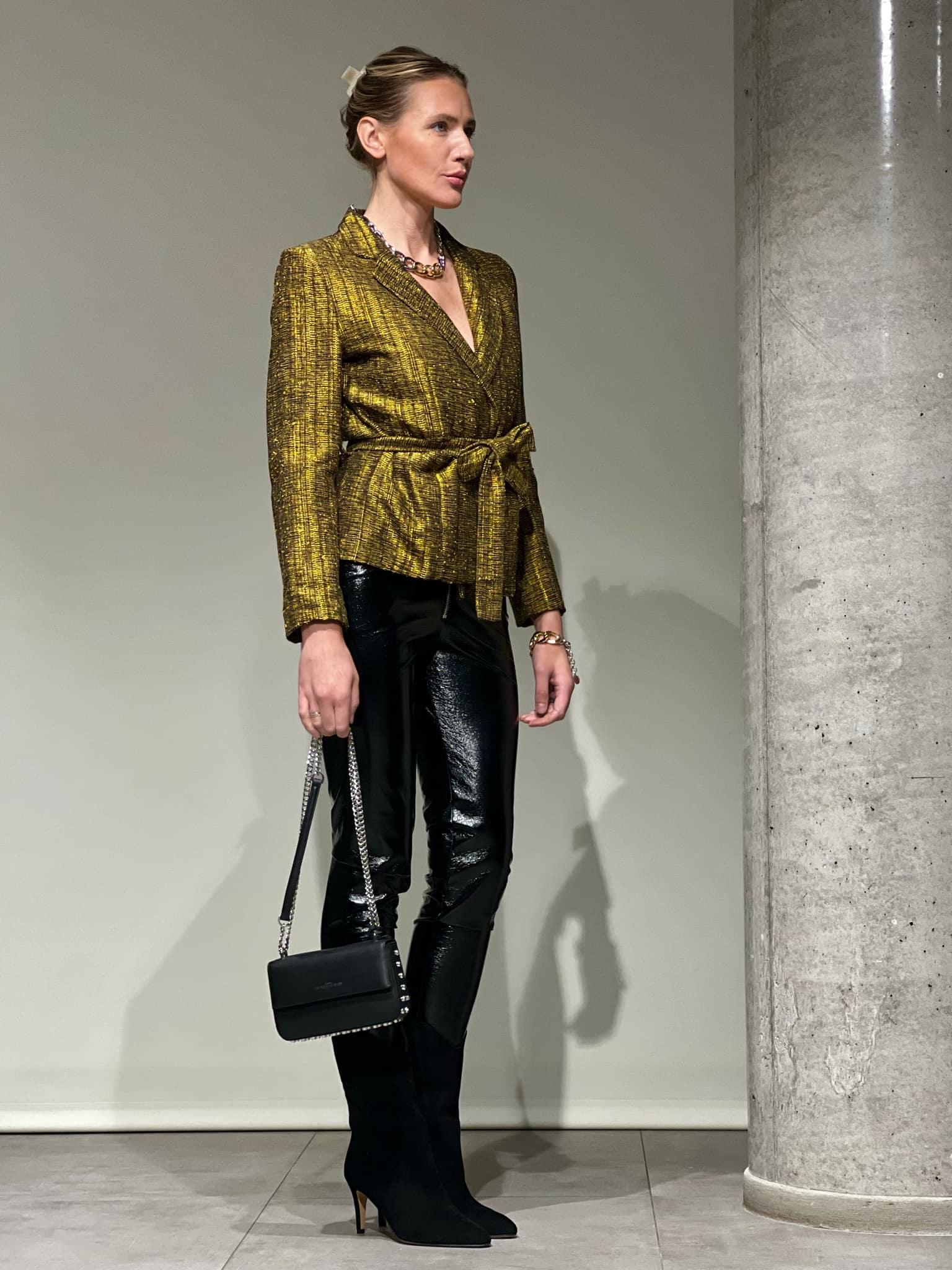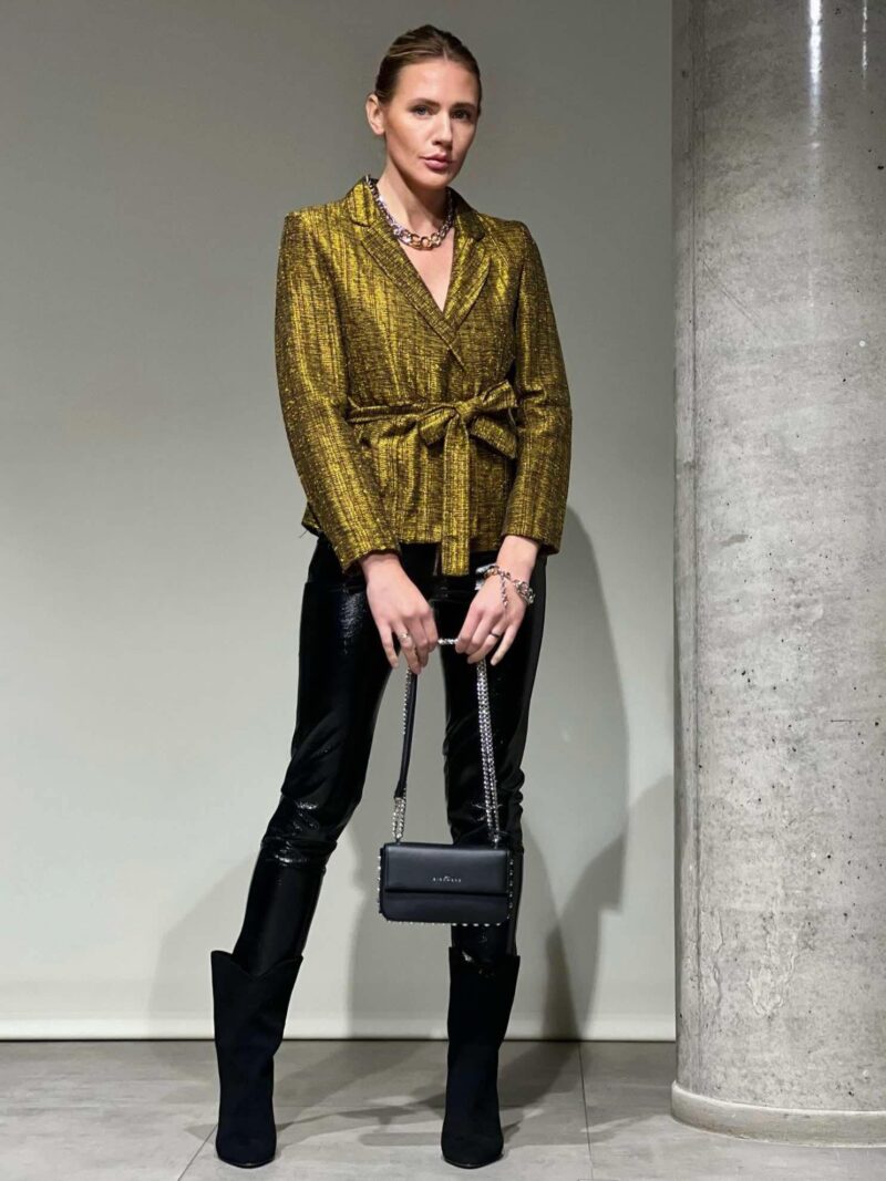Stilingas austo aukso mišinio švarkas su juosmens diržu, tinka XS dydžiui